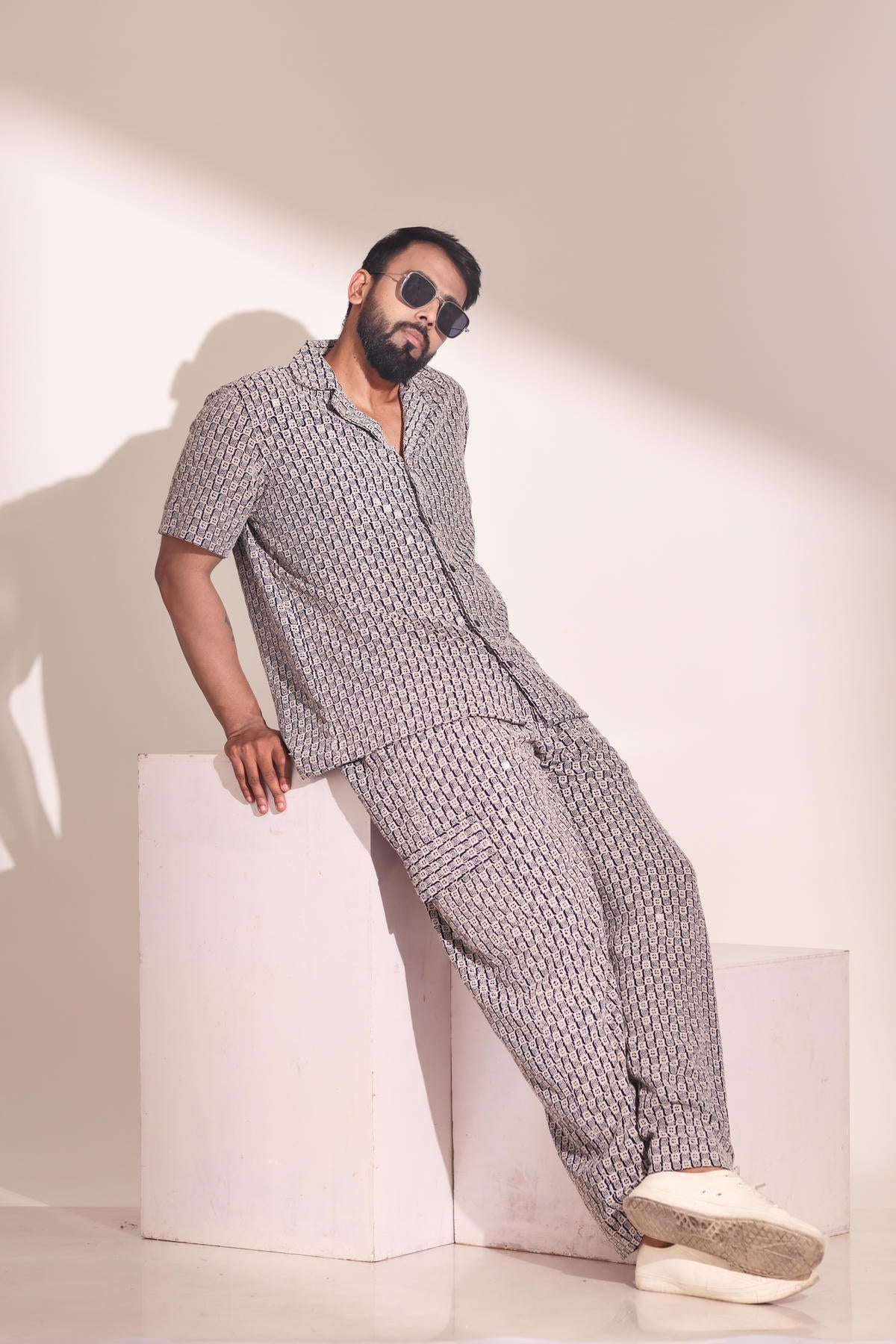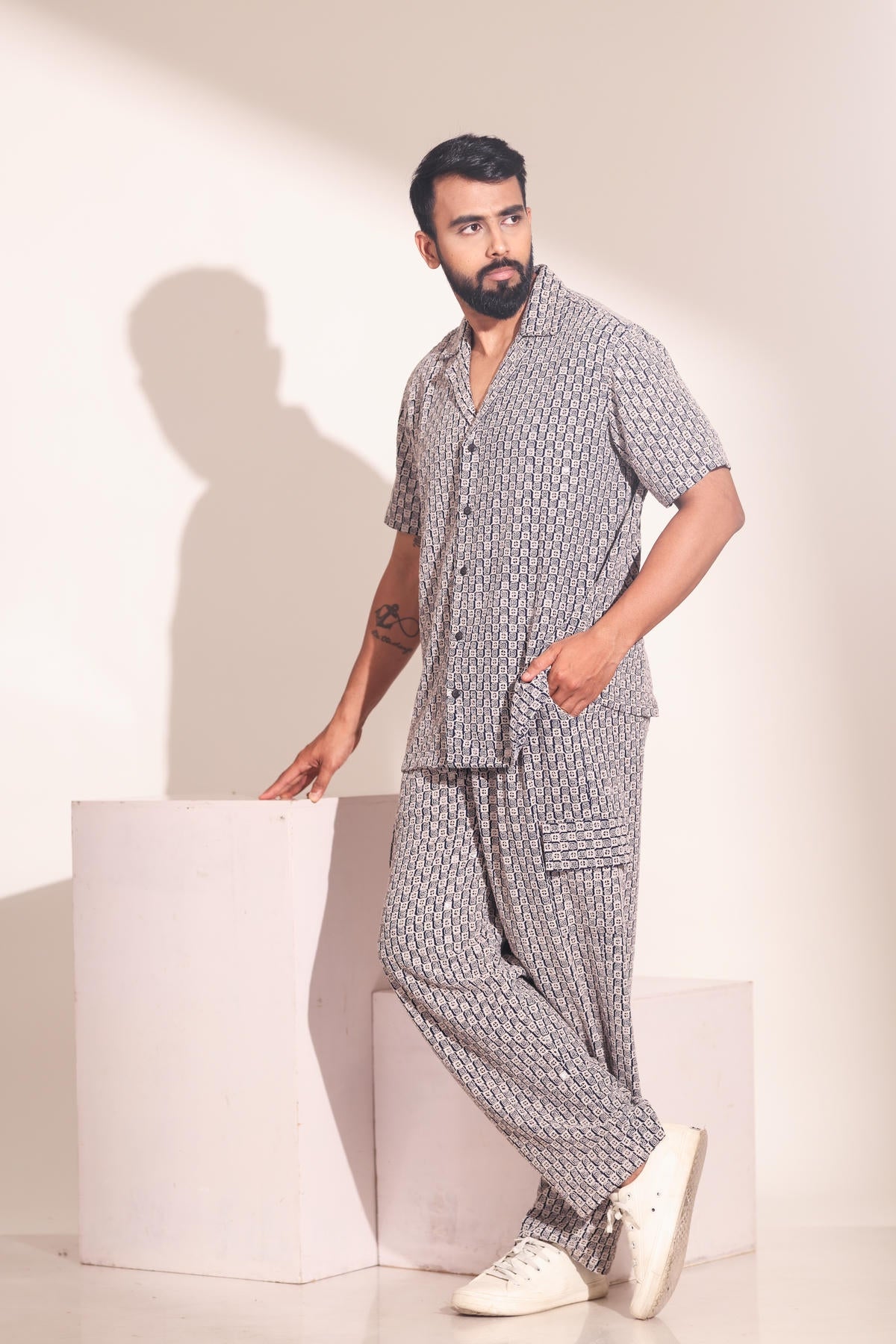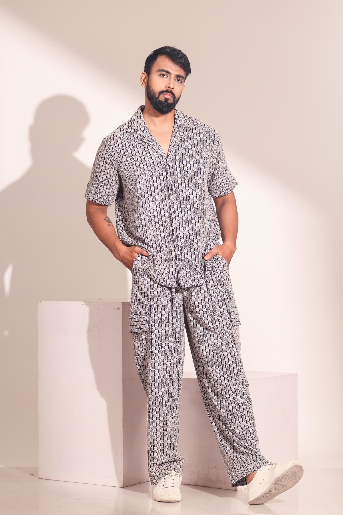A relaxed yet structured co-ord set designed for effortless city living. The monochrome geometric print blends minimalism with movement, while the breezy short-sleeve shirt pairs seamlessly with wide-leg cargo trousers. Styled with white sneakers, this look channels an easygoing, contemporary masculinity—perfect for travel, street strolls, or lounge sophistication.