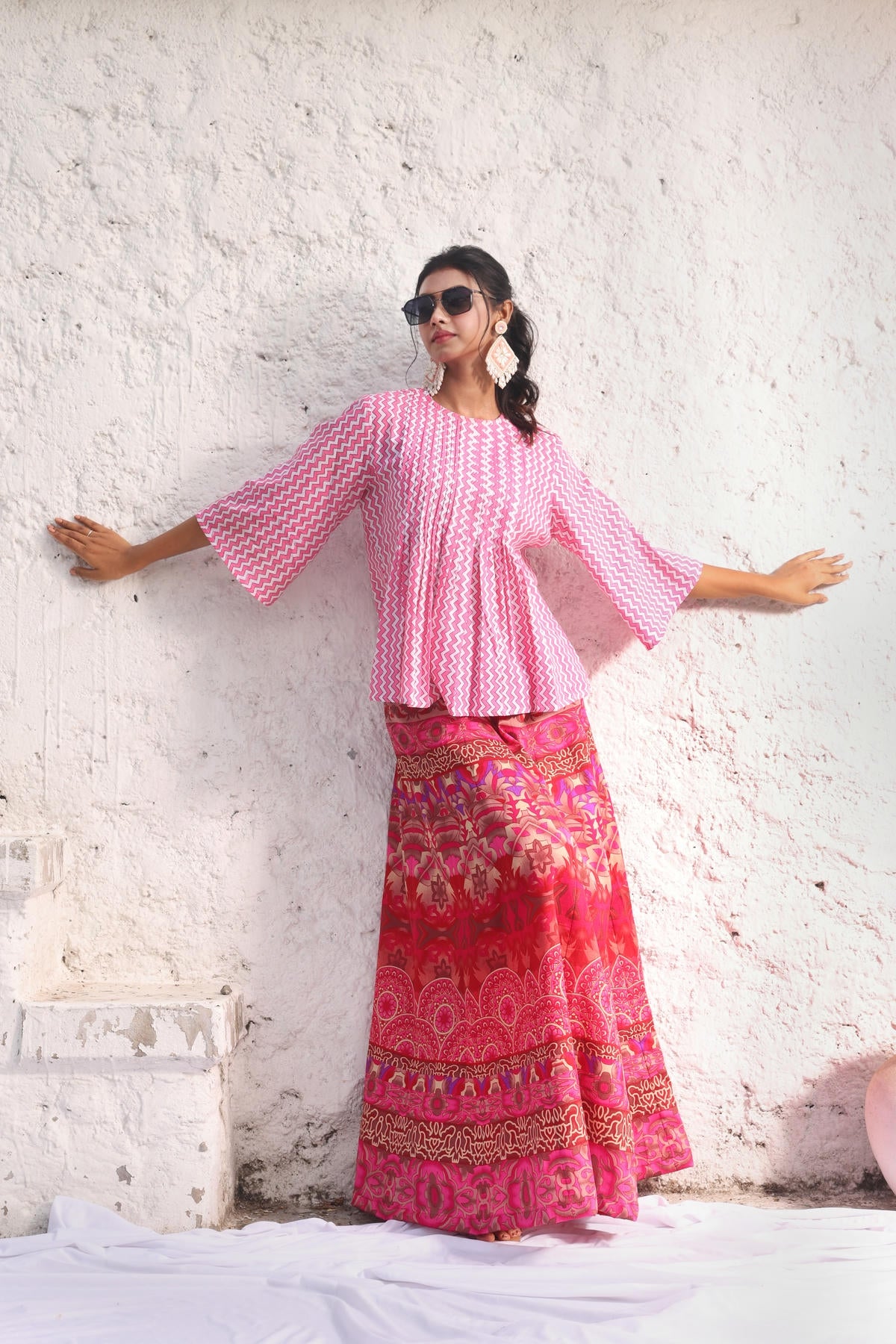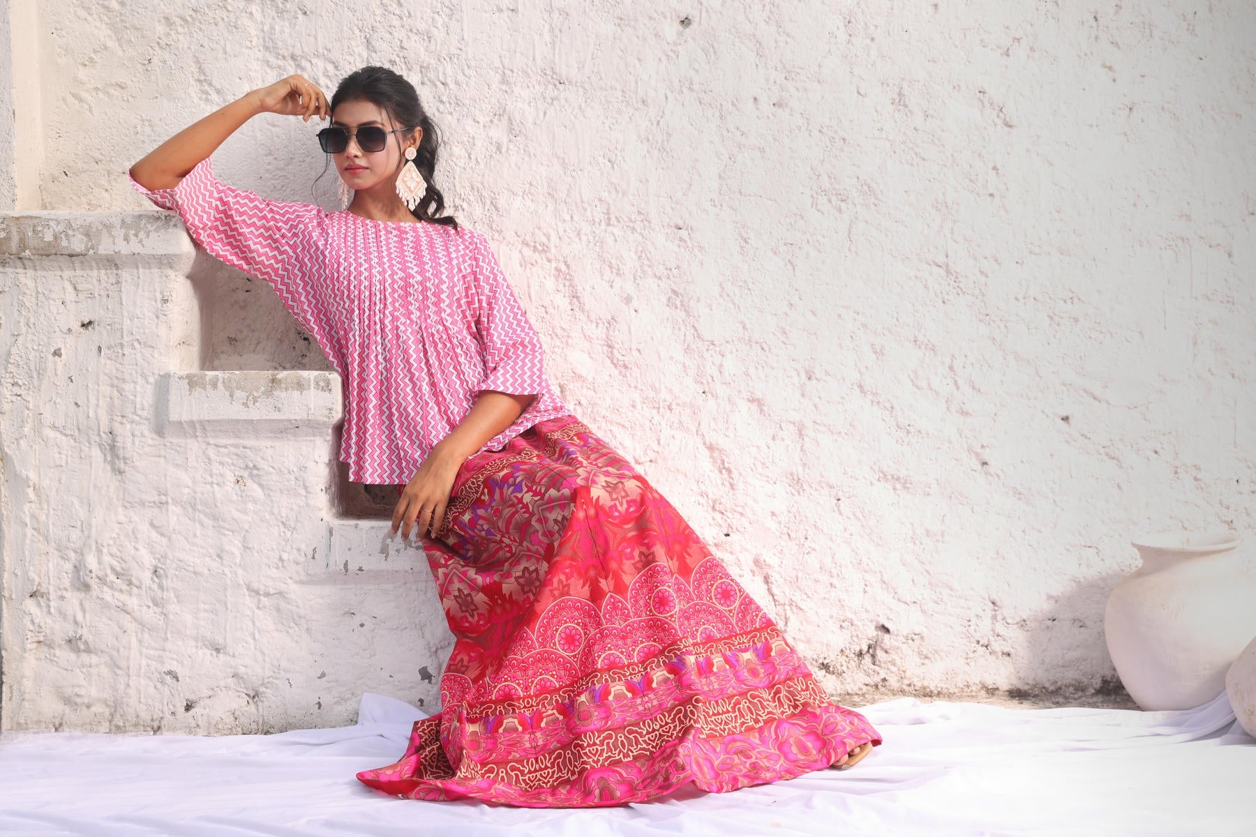 A celebration of color and craft, this fusion look pairs a pink zig-zag patterned top with a rich, floral-printed skirt. The contrast of modern geometry and traditional motifs makes it a perfect choice for festive evenings or casual getaways where you want to stand out effortlessly.