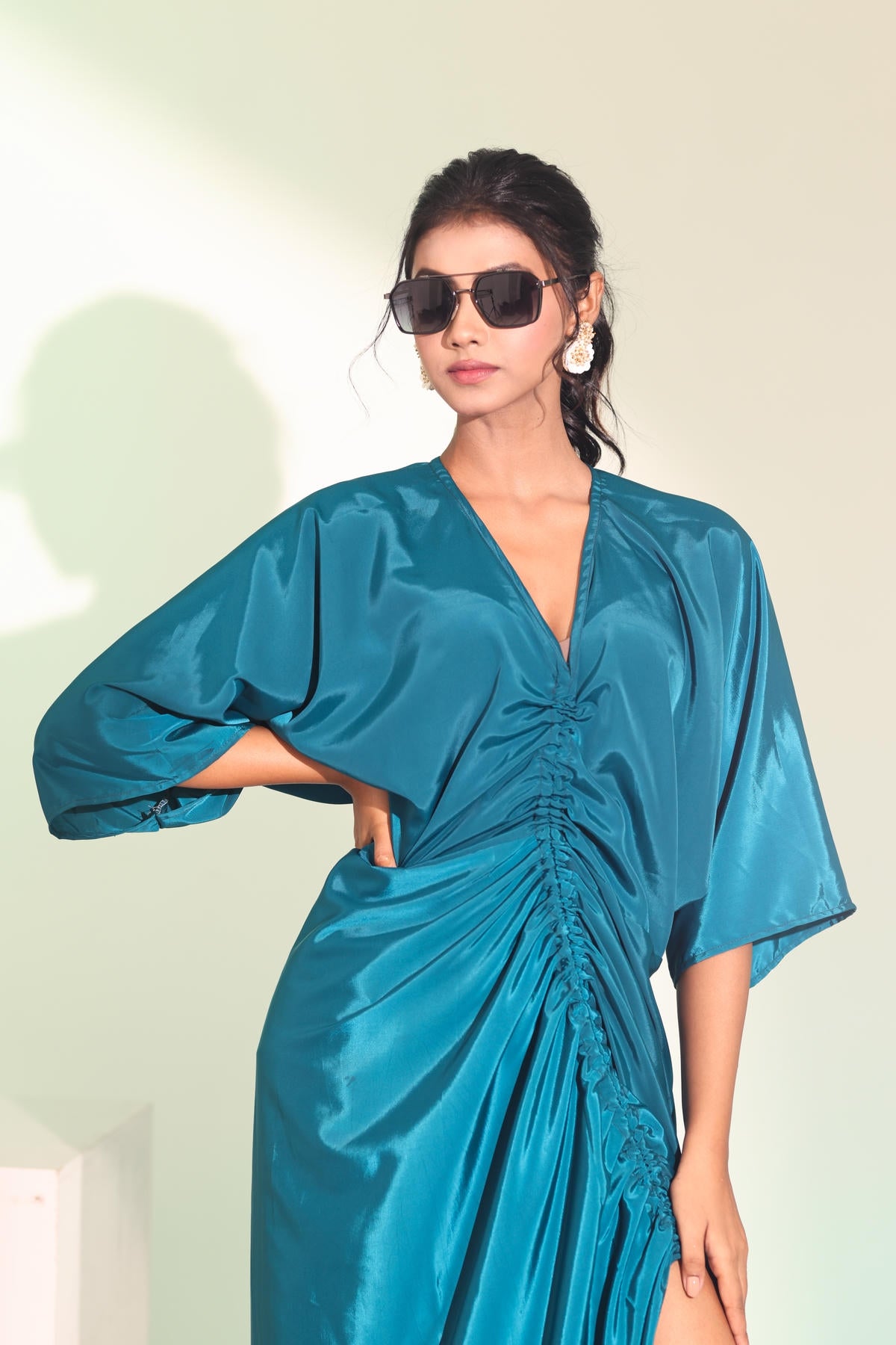 Bold and fluid, this deep teal draped gown exudes contemporary drama. The ruched centerline detailing sculpts movement, while voluminous batwing sleeves balance a daring thigh-high slit. Effortless glamour meets commanding presence—perfect for the woman who embraces both freedom and allure.