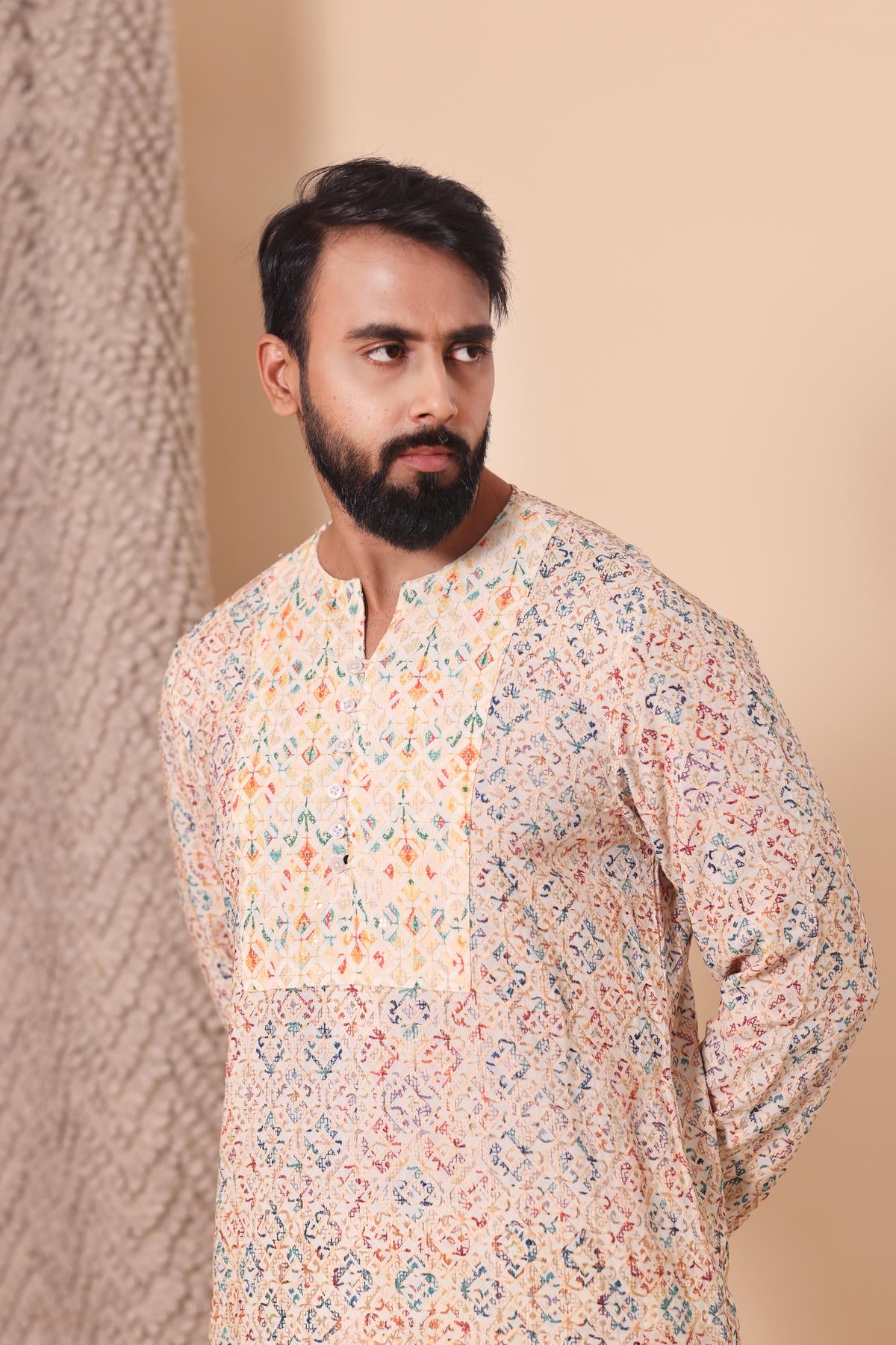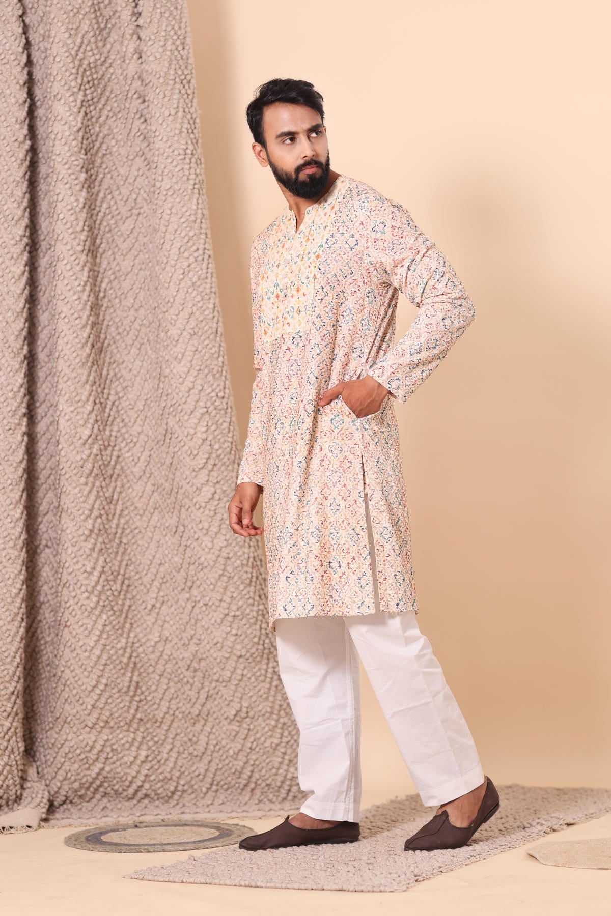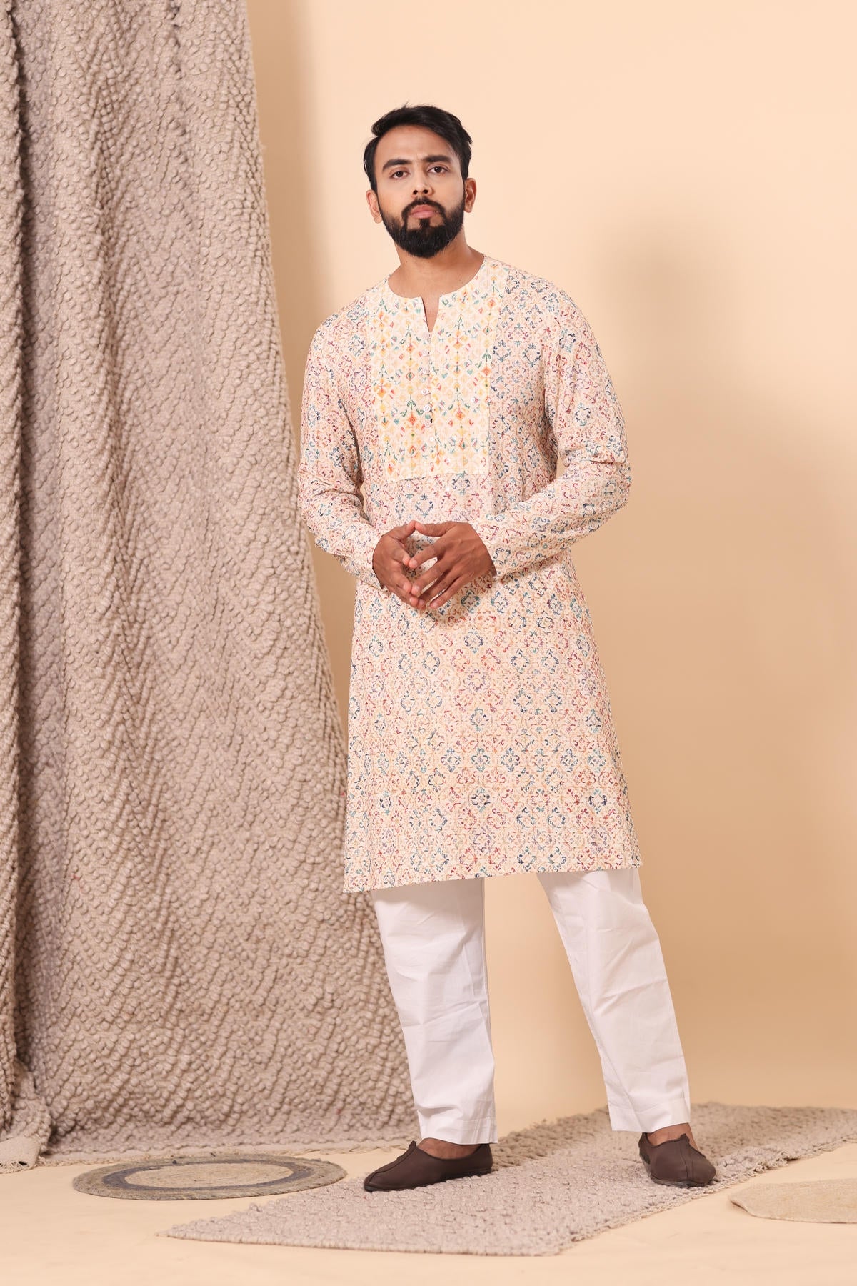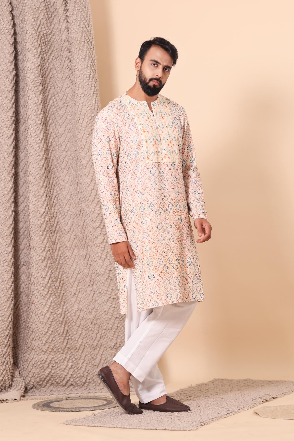 A modern kurta set that marries tradition with subtle artistry. The pastel-toned floral motifs over a soft base exude calm sophistication, while the relaxed silhouette ensures all-day comfort. Perfect for festive gatherings or serene evenings, this look balances cultural heritage with contemporary ease.