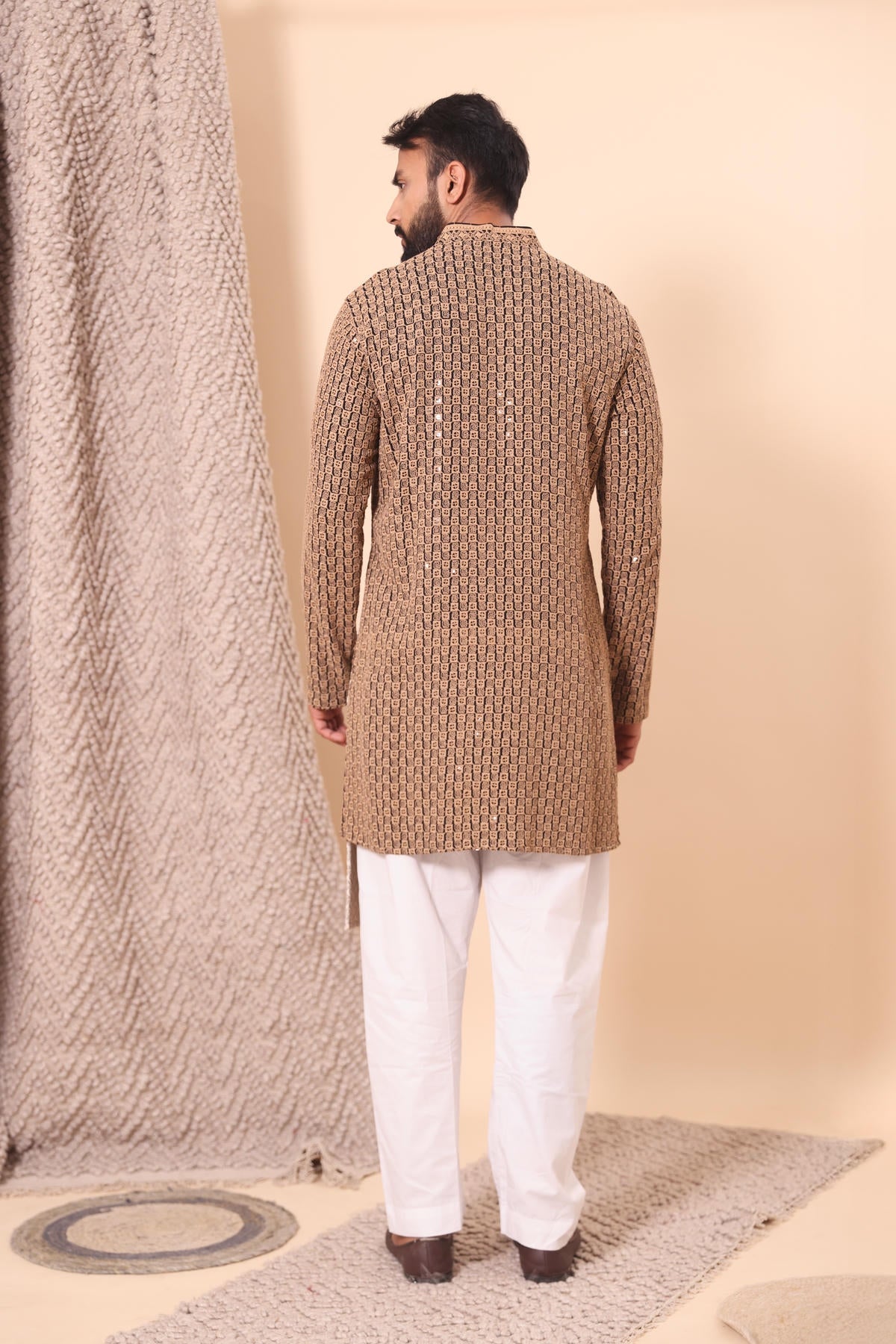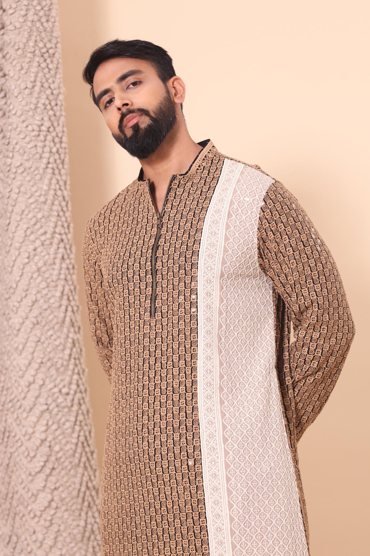 This modern kurta set marries tradition with contemporary comfort. The earthy tones and breathable fabric offer a relaxed, yet refined silhouette that’s perfect for casual gatherings.