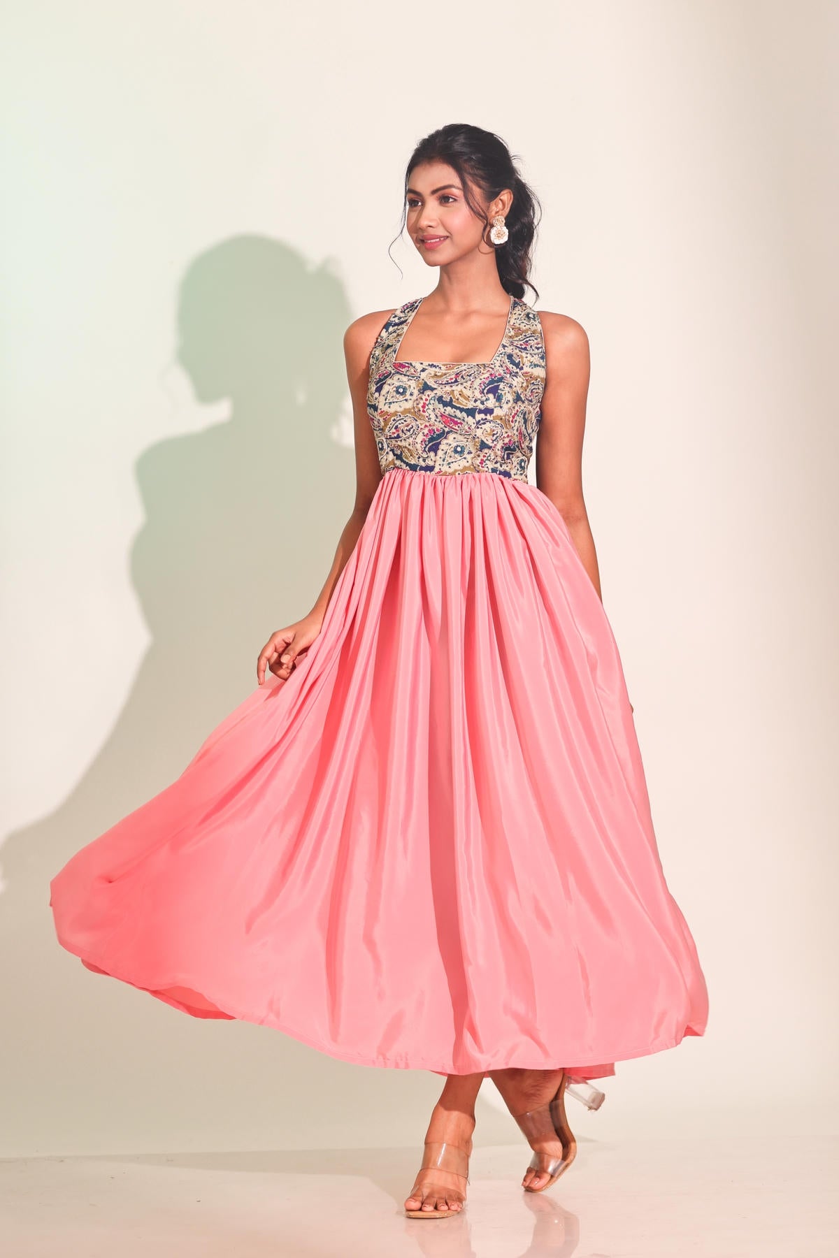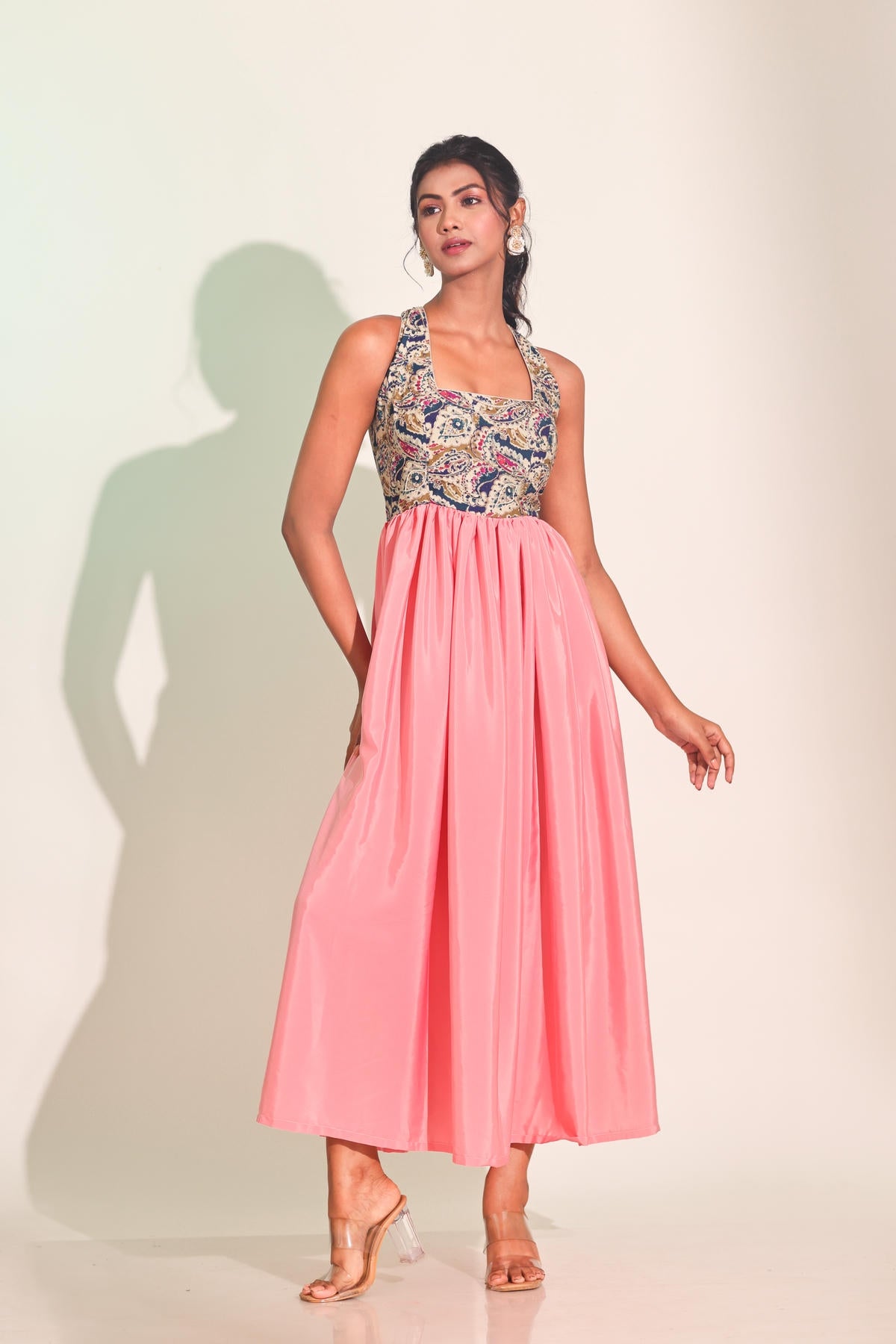 Radiating charm and grace, this flowing blush pink dress is paired with an intricately patterned bodice that adds depth and artistry. The soft, voluminous skirt moves like a melody, making it the perfect piece for those who carry both elegance and playfulness in their style.
